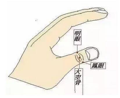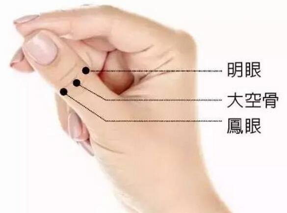 這組穴位分別位于拇指關(guān)節(jié)的兩側(cè)及中間處。明眼穴和鳳眼穴可改善急性結(jié)膜炎,還可以抑制老人性的白內(nèi)障。