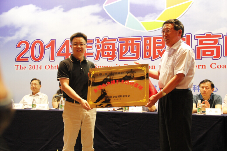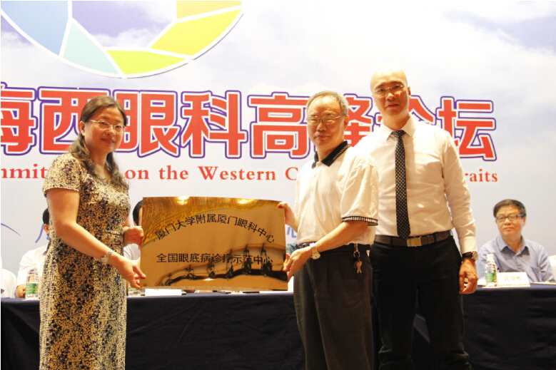 下午15:00,論壇為廈門大學(xué)附屬?gòu)B門眼科中心被授予“全國(guó)白內(nèi)障手術(shù)培訓(xùn)基地”及“全國(guó)眼底COE示范中心”舉行了簡(jiǎn)短而隆重的掛牌儀式。“全國(guó)白內(nèi)障手術(shù)培訓(xùn)基地”牌匾由中國(guó)防盲技術(shù)指導(dǎo)組副組長(zhǎng)徐國(guó)興教授代表中華醫(yī)學(xué)會(huì)授予廈門眼科中心白內(nèi)障???,以表彰和肯定廈門眼科中心在白內(nèi)障手術(shù)培訓(xùn)方面所具備的優(yōu)越條件和豐富經(jīng)驗(yàn)。隨后,北京大學(xué)公共衛(wèi)生學(xué)院流行病與衛(wèi)生統(tǒng)計(jì)學(xué)系副主任詹思延為廈門眼科中心眼底病專科頒發(fā)了“全國(guó)眼底COE示范中心”牌匾。