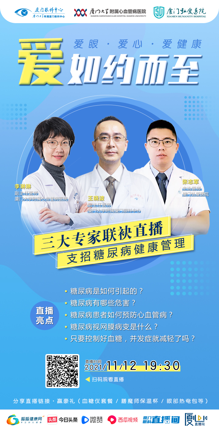 11月12日(周五)晚19:30,廈門大學(xué)附屬?gòu)B門眼科中心攜手廈門大學(xué)附屬心血管病醫(yī)院、廈門弘愛(ài)醫(yī)院共同開(kāi)展聯(lián)合國(guó)糖尿病日大型公益直播活動(dòng)。