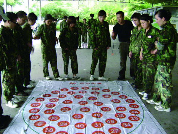 一張印有50個豪無規(guī)律數(shù)字的塑料毯,項目要求團(tuán)隊在最快的時間里按1~50的順序踩數(shù)字,同時不能踩到毯子以及毯子上方不能同時出現(xiàn)兩只腳,否則要重新開始。在這項目中我們的“必勝莊園隊”認(rèn)真思考,仔細(xì)研究塑料毯上看似無規(guī)律的數(shù)字其實也不是完全沒有規(guī)律的,上方的數(shù)字?jǐn)[放比較稀疏,左右兩側(cè)和下方會相對密集。于是他們根據(jù)數(shù)字的規(guī)律調(diào)整人員分布,左右兩側(cè)和下方盡量多些人,大家手拉手互相扶持。果然,很有效率,輕輕松松地完成并以較短時間戰(zhàn)勝。而“勇者無敵隊”,由于沒有講究方法進(jìn)行協(xié)條分工,是幾個人輪流踩數(shù)字,一直圍繞著毯子在跑與踩。幾輪下來,一個個滿頭大汗,也筋疲力盡,結(jié)果還是以戰(zhàn)敗告終。