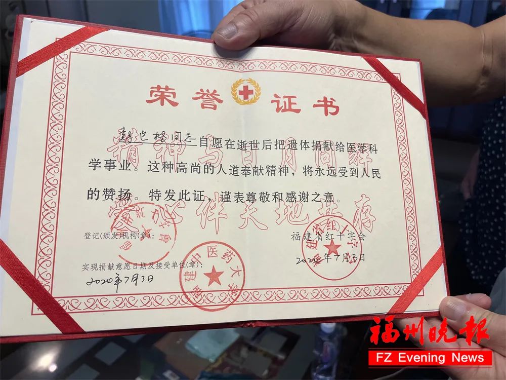當(dāng)晚9時(shí)多,按照其遺愿,他如愿以償,捐獻(xiàn)有用的器官——眼角膜,并“坐”上開(kāi)往福建中醫(yī)藥大學(xué)的車子,成為一名大體老師(醫(yī)學(xué)界對(duì)遺體捐贈(zèng)者的尊稱)。