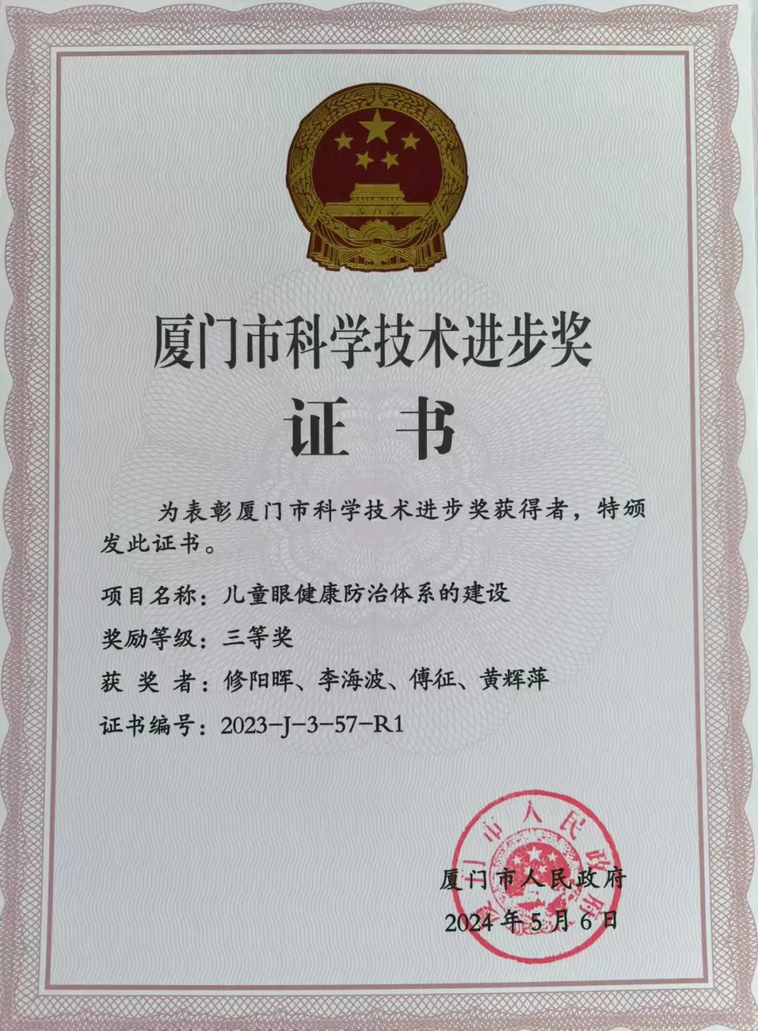 12月16日,廈門市科學(xué)技術(shù)大會(huì)在廈門人民會(huì)堂隆重舉行,大會(huì)現(xiàn)場(chǎng)為獲得2023年度廈門市科學(xué)技術(shù)獎(jiǎng)的科研人員代表頒獎(jiǎng)。由廈門眼科中心作為第一完成單位,斜視與小兒眼科修陽(yáng)暉博士、眼外傷及眼底2科李海波博士所在團(tuán)隊(duì)共同完成的“兒童眼健康防治體系的建設(shè)”項(xiàng)目喜獲廈門市科學(xué)技術(shù)進(jìn)步獎(jiǎng)三等獎(jiǎng),修陽(yáng)暉博士應(yīng)邀出席盛典并代表科研團(tuán)隊(duì)領(lǐng)獎(jiǎng)。